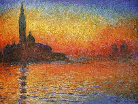 种色彩赋予水面无限的光辉。真实地描绘了法国海港城市日出时的光与色给人的视觉印象。