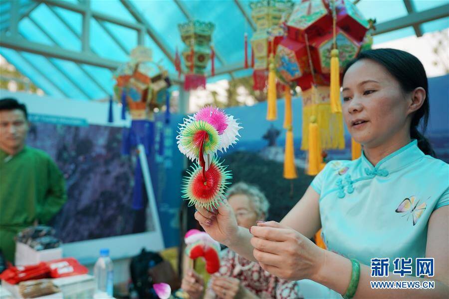 6月23日,来自河南省开封市的张俊丽(右)在“河南日”活动上展示使用制作汴京灯笼余料制作的“汴花”。