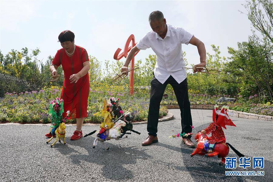 6月23日,来自河南省宝丰县的娄艳俊(右)在河南园内表演提线木偶戏《三英战吕布》。