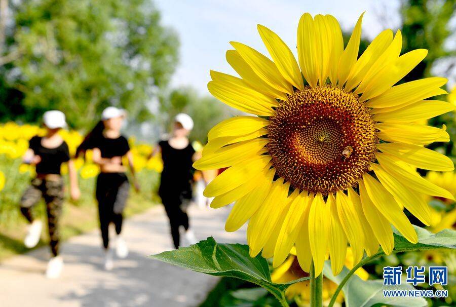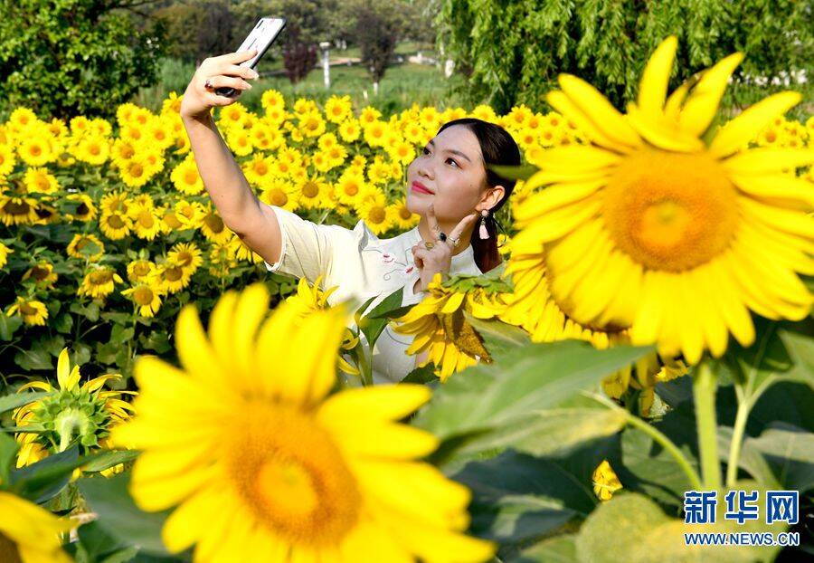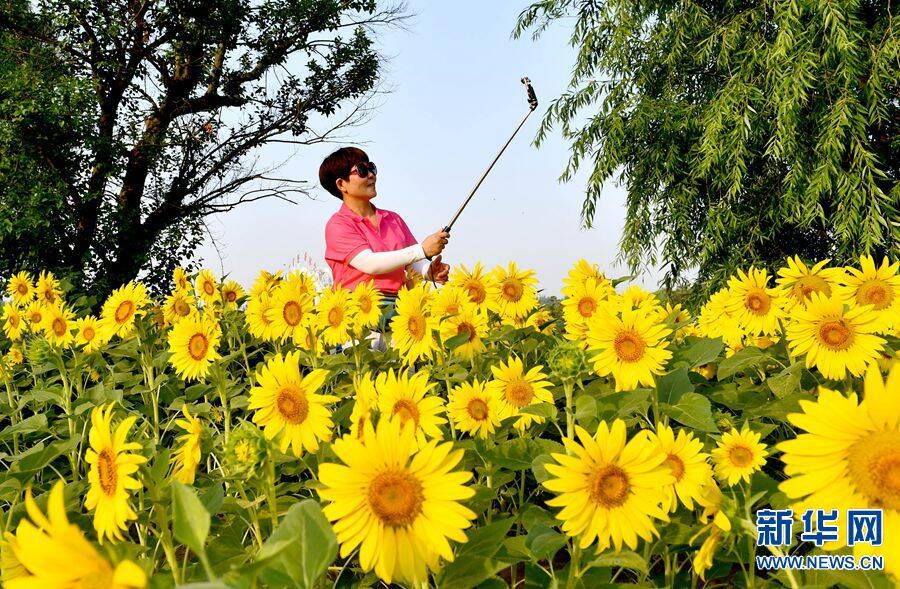 6月23日,河南省夏邑县两河口葵花园,游客在向日葵花间拍照、游玩。 盛夏时节,河南省夏邑县两河口葵花园里的向日葵进入盛花期,金黄色的葵花像一张张“笑脸”迎风摇曳,吸引游客前来观赏。新华网发(苗育才 摄)