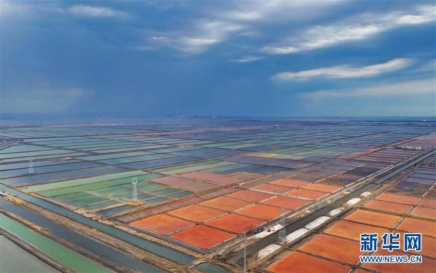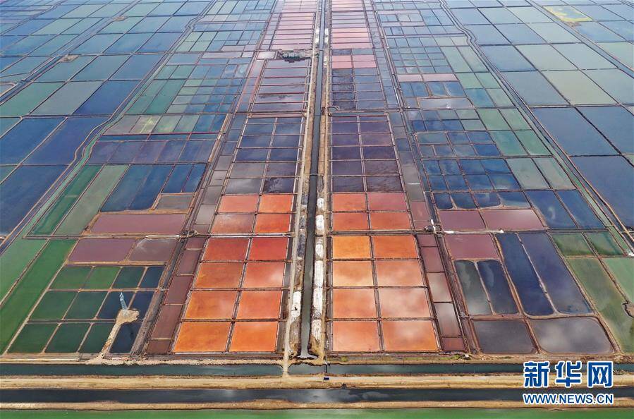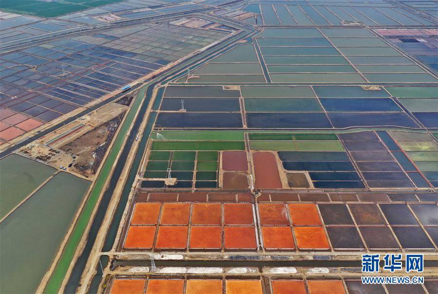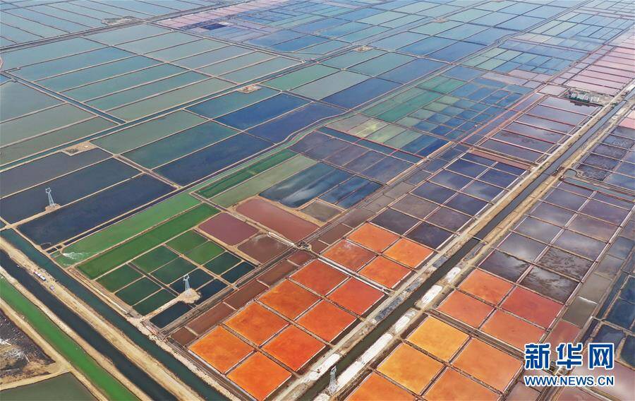 7月3日拍摄的大清河盐场(无人机拍摄)。 从空中俯瞰河北省唐山市海港经济开发区大清河盐场,不同浓度的盐池呈现不同的色彩,犹如大地上的巨型调色板。 新华社记者杨世尧摄