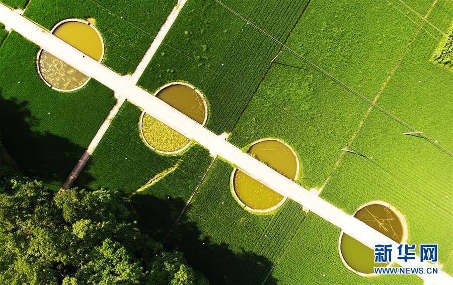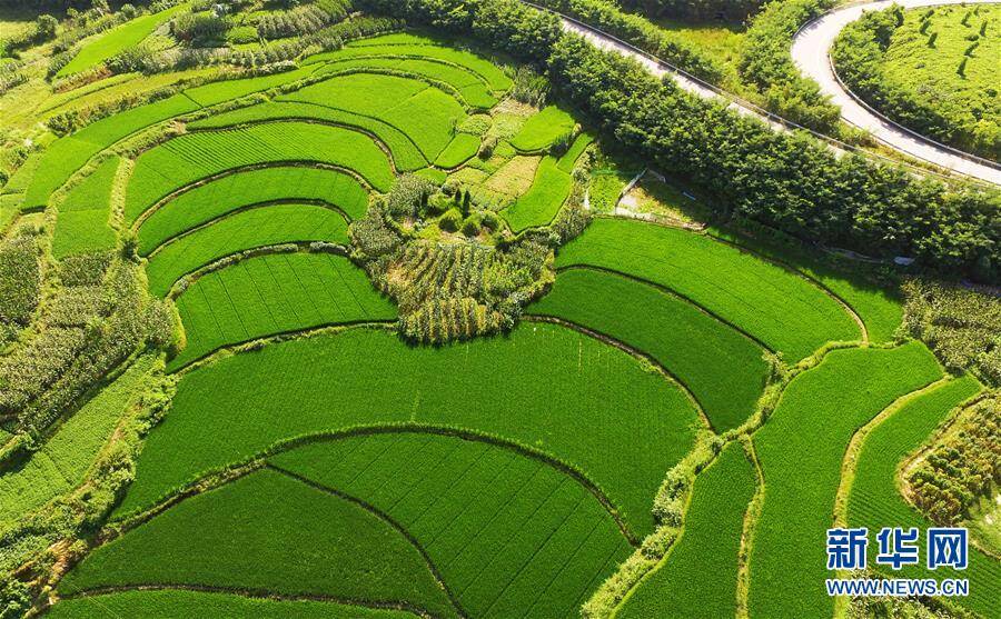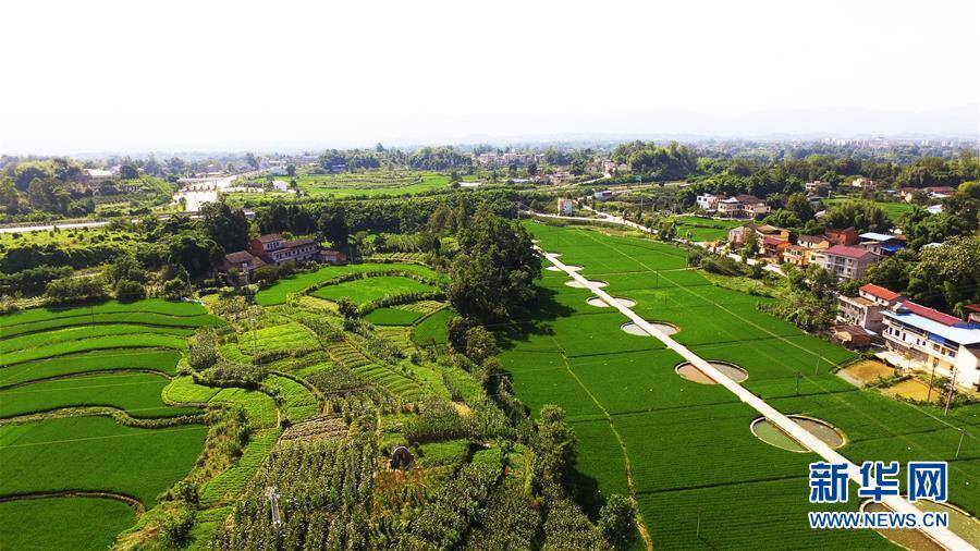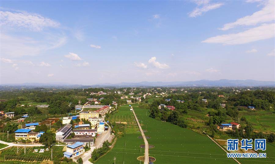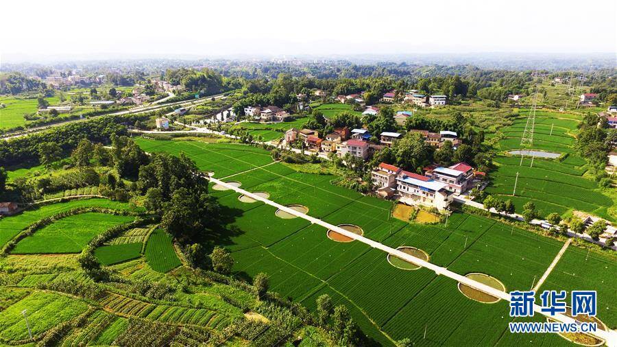 7月2日在忠县马灌镇果园村拍摄的田园景象(无人机拍摄)。 仲夏时节,重庆忠县马灌镇果园村一带的稻田、树木、民居等构成一道秀美的夏日风景线。 新华社记者 王全超 摄